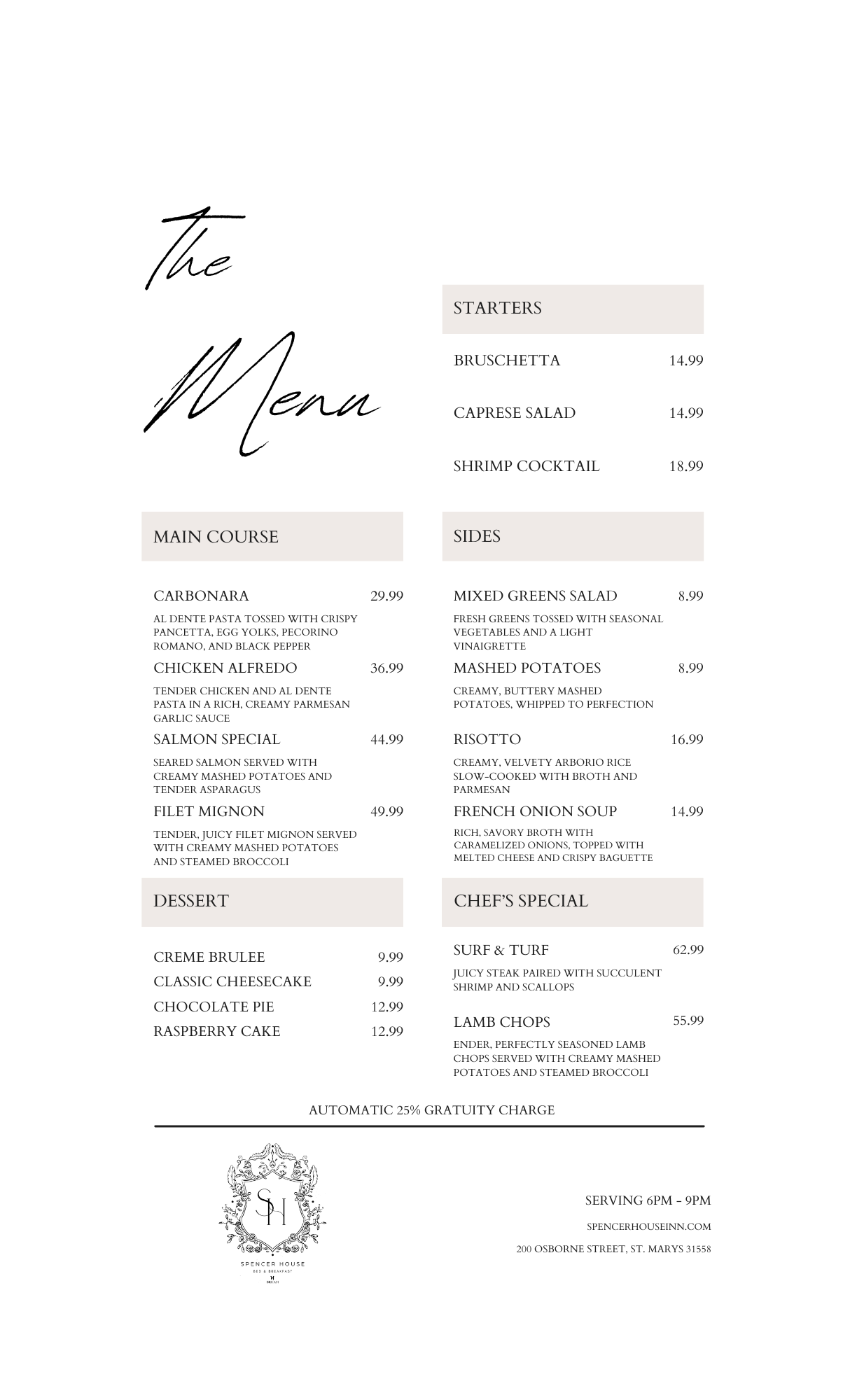 Experience Charm and Comfort in GeorgiaDiscover a delightful bed and breakfast experience showcasing Southern comfortfood with a twist, served in a beautiful historic setting. VIEW BRUNCH MENU drink MENU dinner menu reservations Global Seasonal FlavorsSavor an ever-evolving menu of globally inspired dishes crafted with fresh,seasonal ingredients in an intimate, historic setting.